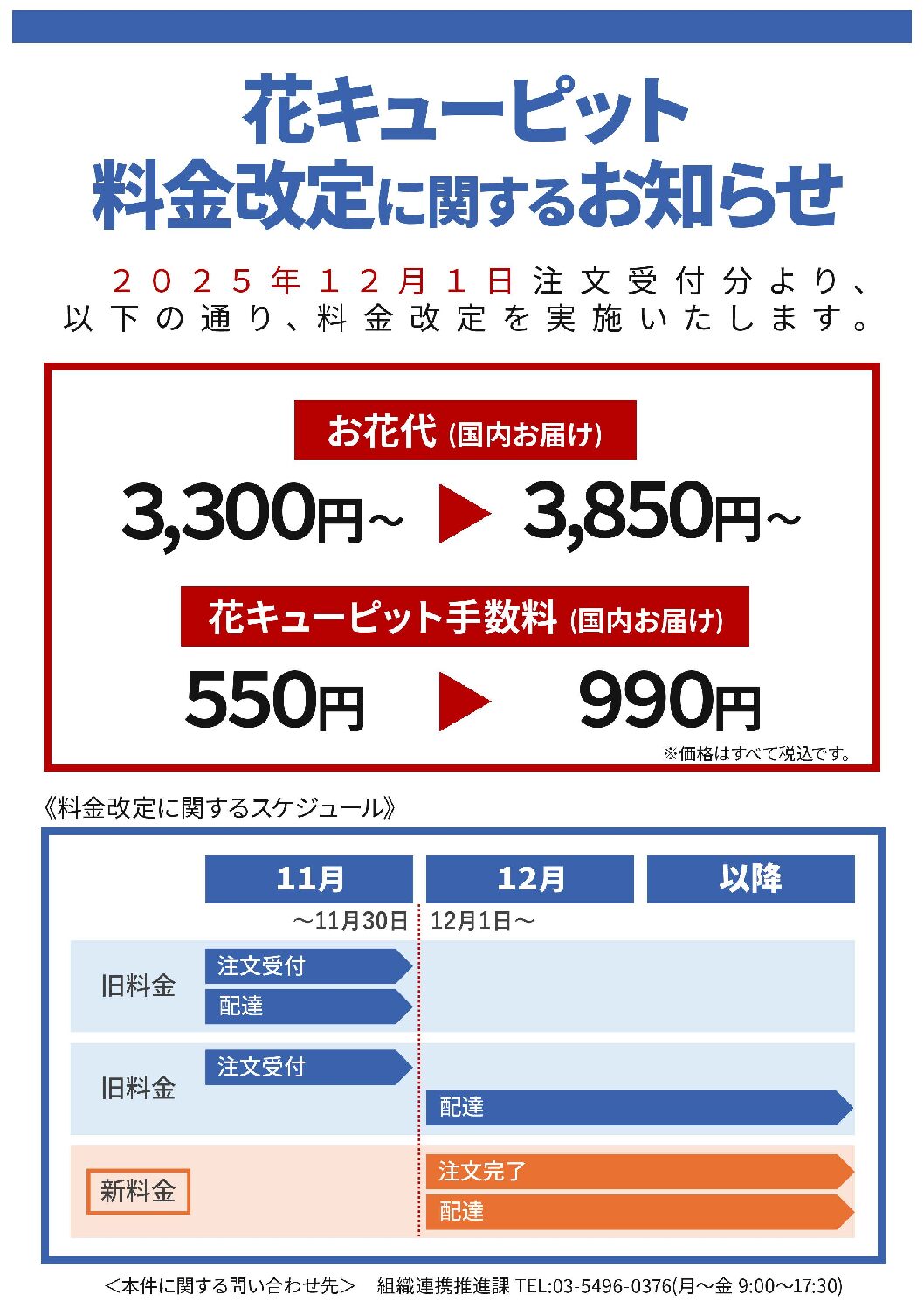 花キューピット料金改定と当店の配達に関するお知らせ 投稿日: 2025年11月17日 Flower Balloonカテゴリー: お知らせ いつもフラワーバルーンをご利用いただきありがとうございます。 花キューピットの料金改定が行われますのでお知らせ […]